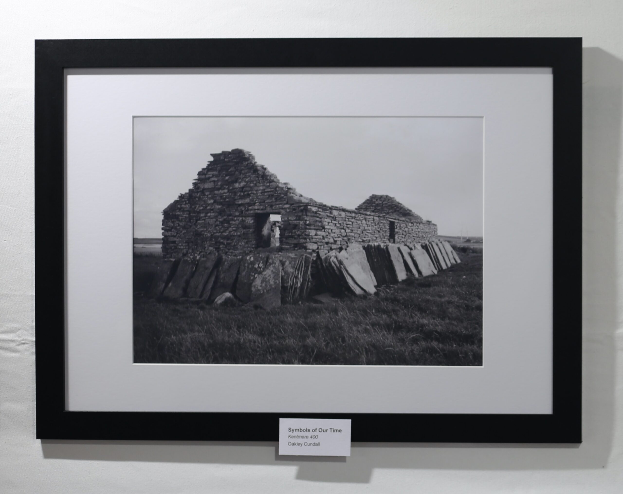 New works included Oakley Cundalls’ series of six black and white film photographs which were placed along the back wall of the gallery. Crumbling walls, churchyards and empty crofts signal a passing of human time. These structures were erected by people a few generations before us, and forgotten by the generation after. Oakley’s careful photography restores a sense of care to them, and doesn’t lament the gentle decay. Nature in Parallel, a portrait photo taken on a Kentmore 400, compares a much greater passage of time: a figure on a manmade pier of the right is contrasted with nature’s continuum between land and sea. Two outcrops of rock which were formed over millions of years, which saw changes in sea level, climate and species sit on the left. This exhibition reminds us that rocks do form: they weren’t always there, and the stone formations which look so permanent to the figure on the pier grew from somewhere and will shrink away again one day.