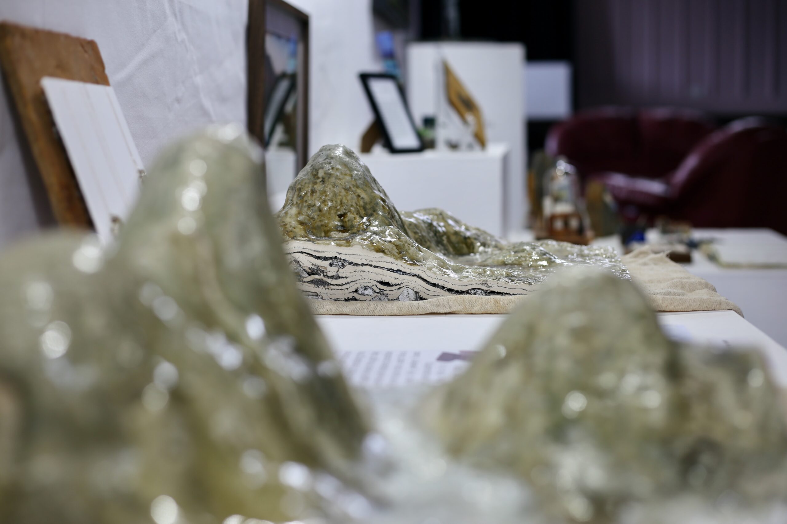 The sculptures in the space give dynamism and maybe even an organic but mathematical stalegmite feel. The faux walls along either side show flatter works; school pupils pictures of Bismuth, Stonehenge, Amethyst, Meteorites and more are along the left beneath portraits of local people nominated as ‘Rocks of Support’, and along the right are the slowly multiplying Duncansby stacks in watercolour, a digital collage exploring Uranium by Caroline Swan, stone texture in ink by Jess Sutherland and a fantastically stylised Dippy the Dipterus by Rising Artist Anne Ruddy.