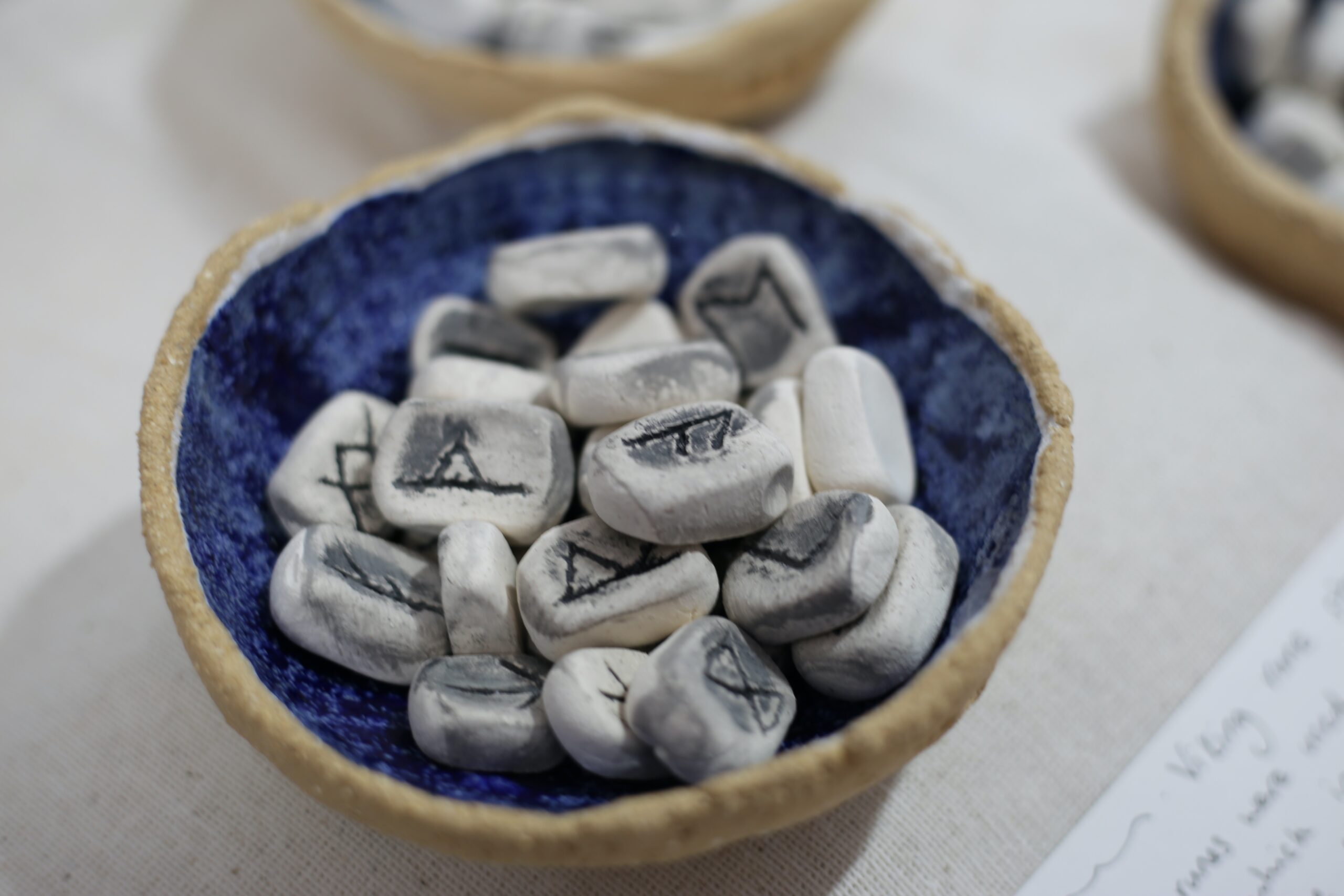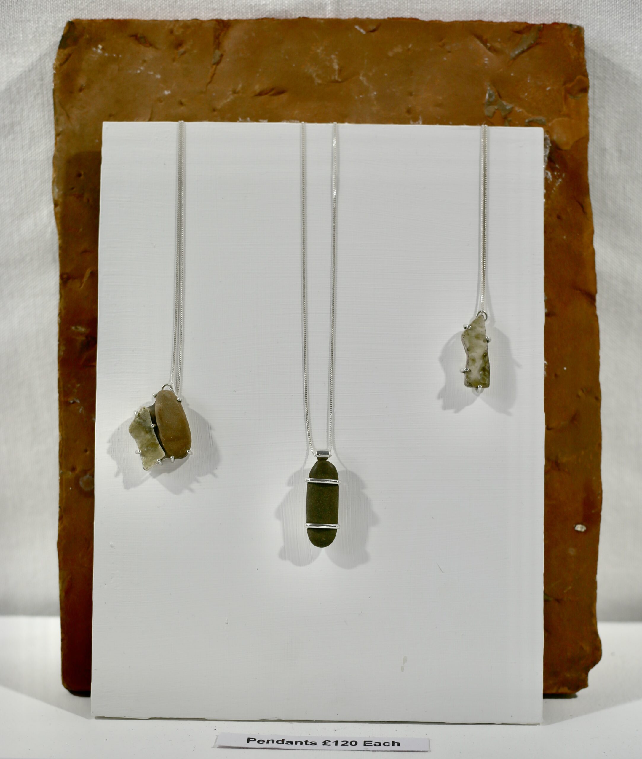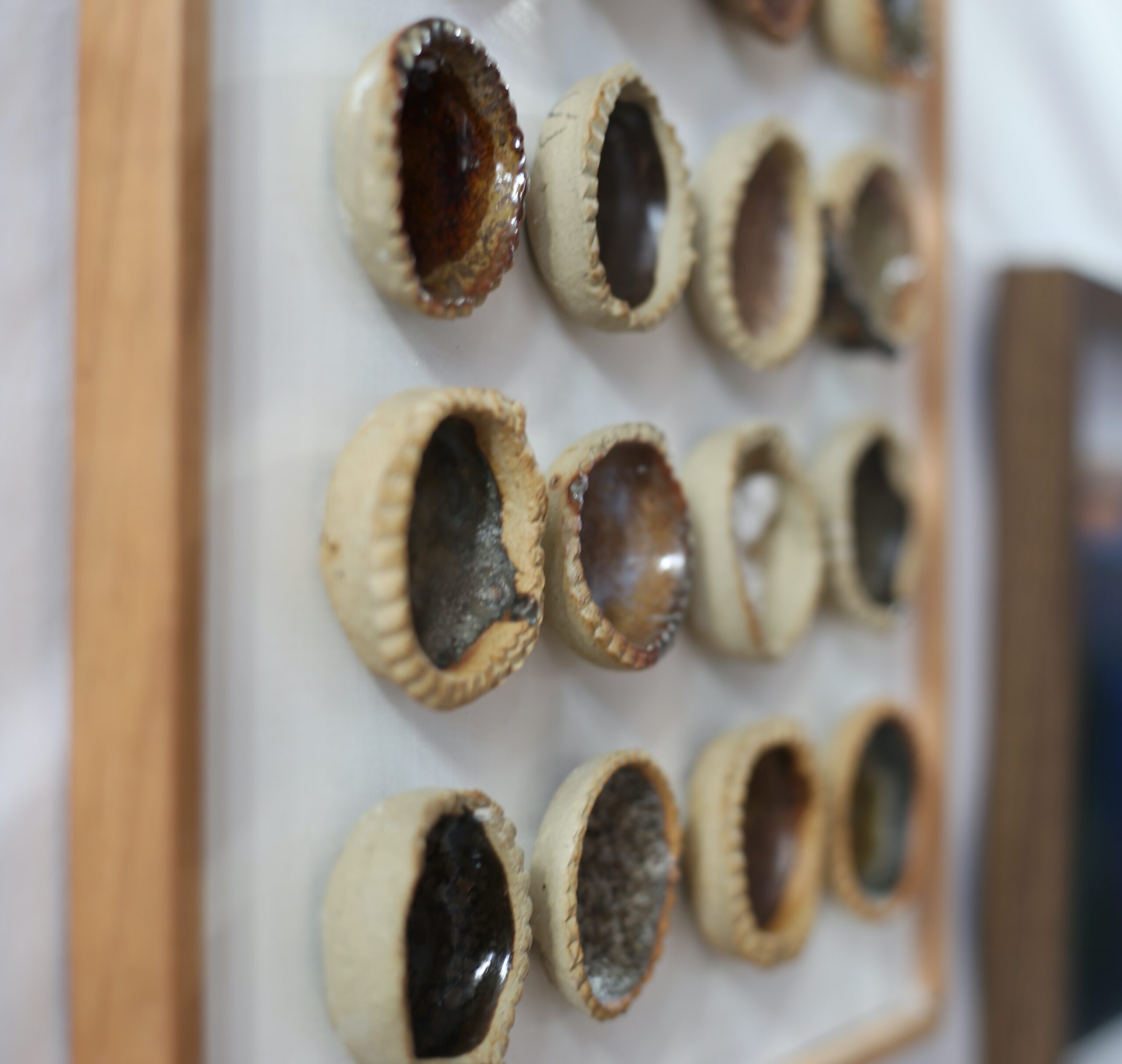Other pieces in the exhibition explored transformation: Kirsty McKinnon’s Creogh na Mara features sea glass – fragments of bottles, boat running lights, Depression era tableware and other items which have dropped in the ocean in one place, and turned up smooth and mystical on the shores of Caithness. Dylan Cundall uses Caithness minerals to create glazes. By gathering and burning what he finds in the landscape: peat, salt, feldspars and copper might all be found here; glazes for ceramics and jewelry are created. Heat here is used as a catalyst for transformation, and the same is seen in Susan Marshall’s wild clay stones. Amongst the incredibly tactile worry stones, runes and selkie bowls are a clay and wild-clay combinations which show how materials react to the temperatures they are exposed to. Susan’s work seems delicate, but the depth of the significance of Norse, Celtic and local culture to her work gives it a gravitational pull.
