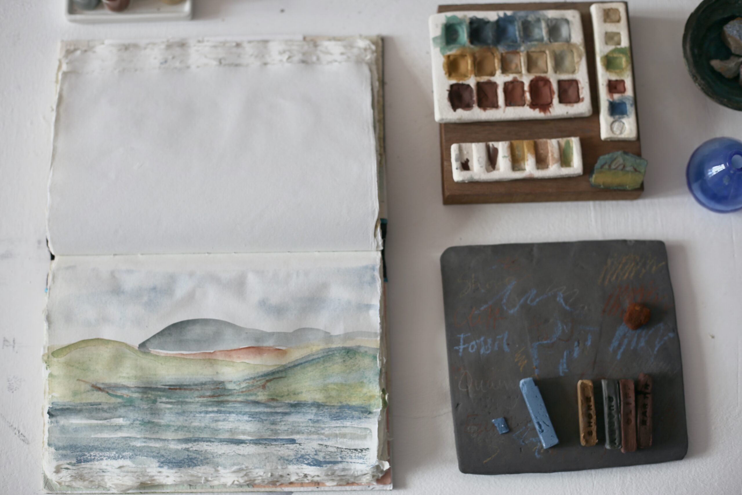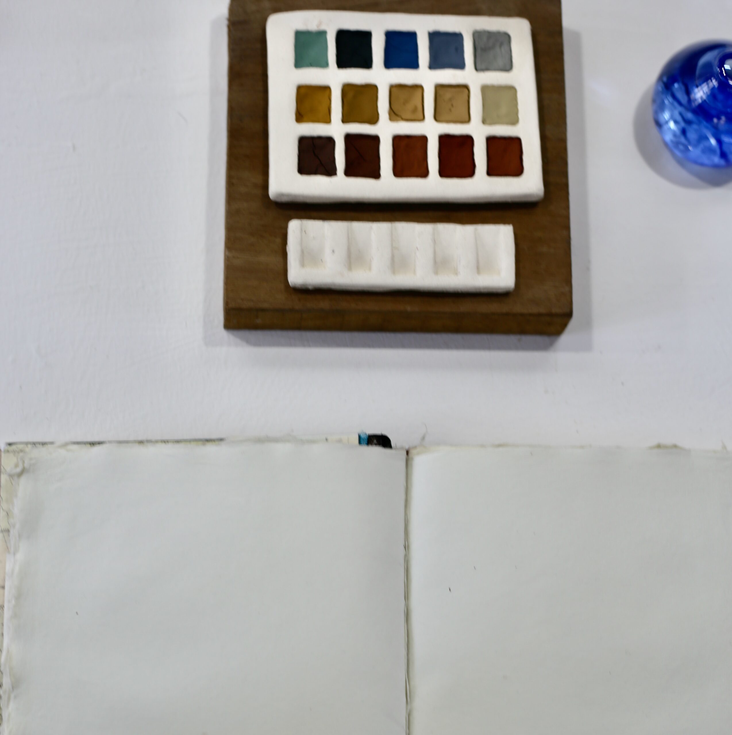 Once collected, these categorized rocks and pebbles were ground down do produce rock residue and the colored powder of pigment. There may have been more to this geological sorcery but this writer has yet to find that out. This powder was then turned into the bottles, a set of chalks, and 2 sets of watercolour paint which, with the open sketchbook next to them, compelled the audience to try out these hand crafted paints.
