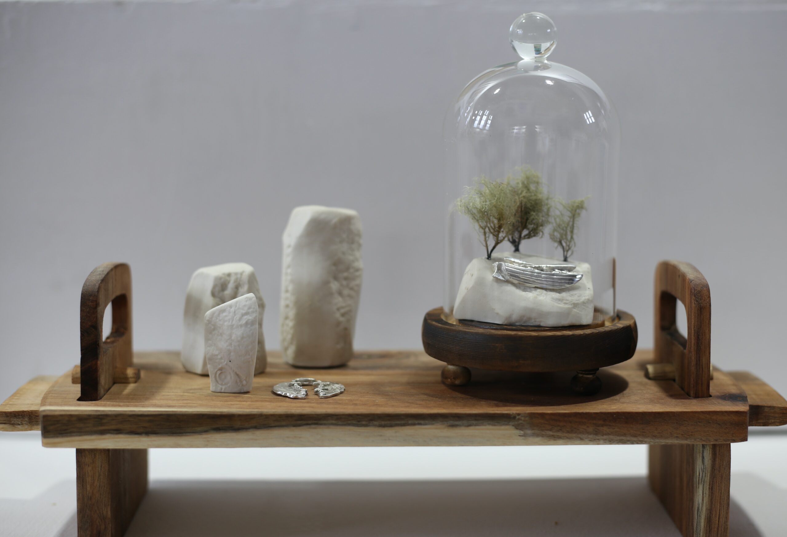 Justine Bainbridge’s work uses heat in its formation of layered glass, space in its’ incorporation of materials such as gold panned in Caithness, felting, fossils, moss, ceramics, and duration.