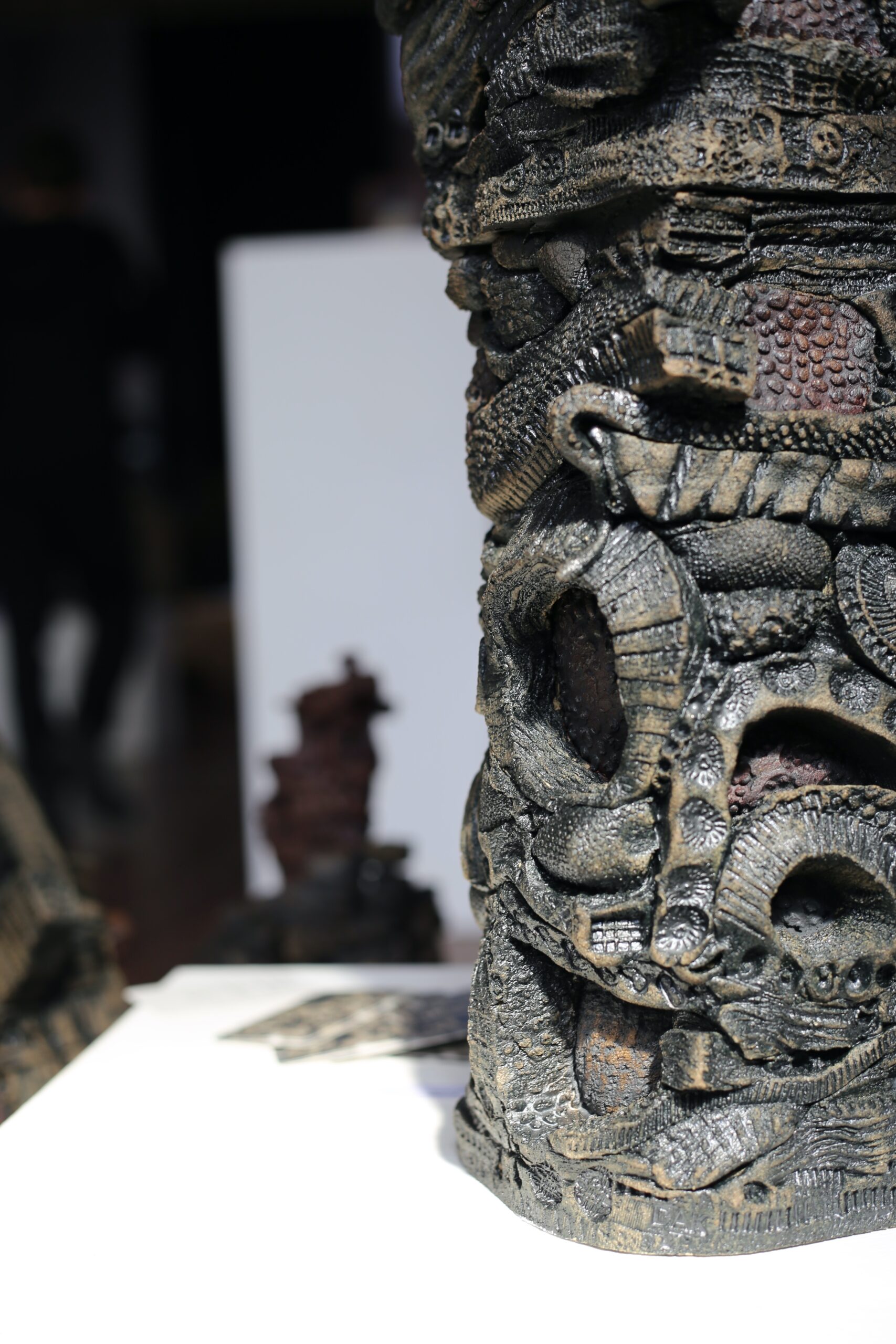 In front of Oakley’s series are a selection of sculptures by ceramicist David Kinghorn. In clay, oxide and resin, David builds up Sea Stacks I & II, Wild Geos, Igneous Intrusions and more. These are earthy, cumulative pieces which speak of layers, geological and biological forms and the dark, sticky substance of life which bind it all together. Visitors found them evocative of Totem poles, the Middle-Earth, the Discworld and the heavenly circle and physical squares, Tiān Yuán Dì Fāng, of Chinese architecture. Time and space become vectors only of the imagination of the viewer here – they can project onto the sculptures the pasts, presents and futures they wish to. Whatever they inspired, or were inspired by, they were a great draw in the gallery space and we look forward to visiting David in September as part of the Dunnet and Brough Open Studios on the 20th and 21st.