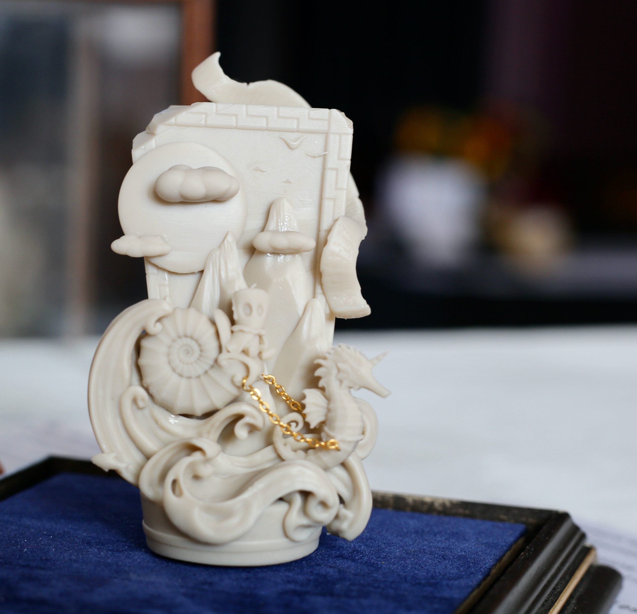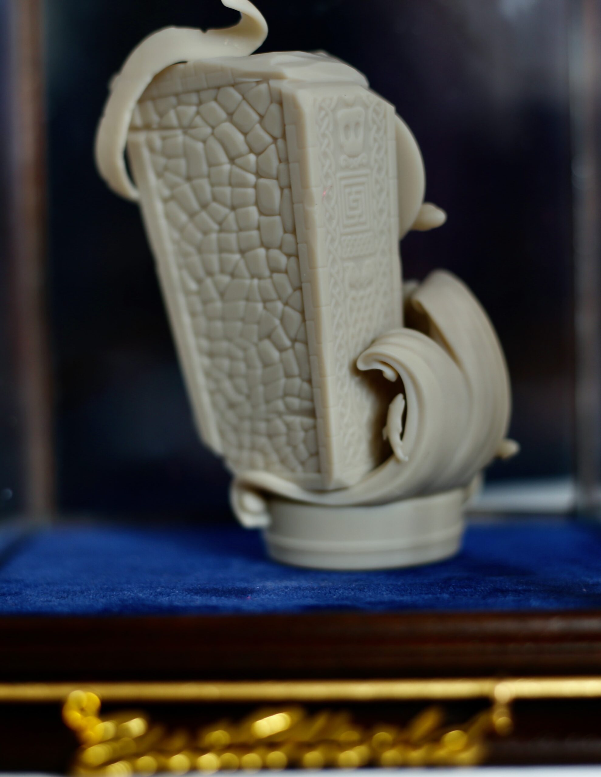 A Noble Journey is a piece no larger than 7cm high. It is made of vanilla coloured resin, and inspired by the legendary Skinnet Stone nearby in Morissons park in Halkirk. The original stone dates back to around the 10th century AD, soon after Christianity appeared in Caithness with Saints Fergus and Drostan in the 8th century. The Pictish carved stone does show symbols of Christianity, but what was inspiring to the artist was the carvings of hippocampi, or waterhorses, the elaborate knotwork and what appears to be a chariot carrying Pictish Nobility at the bottom of the carvings. After seeing the unveiling of the replica Skinnet in Halkirk in May 2025, Voxaetern’art got to work digitally sculpting this piece of work.