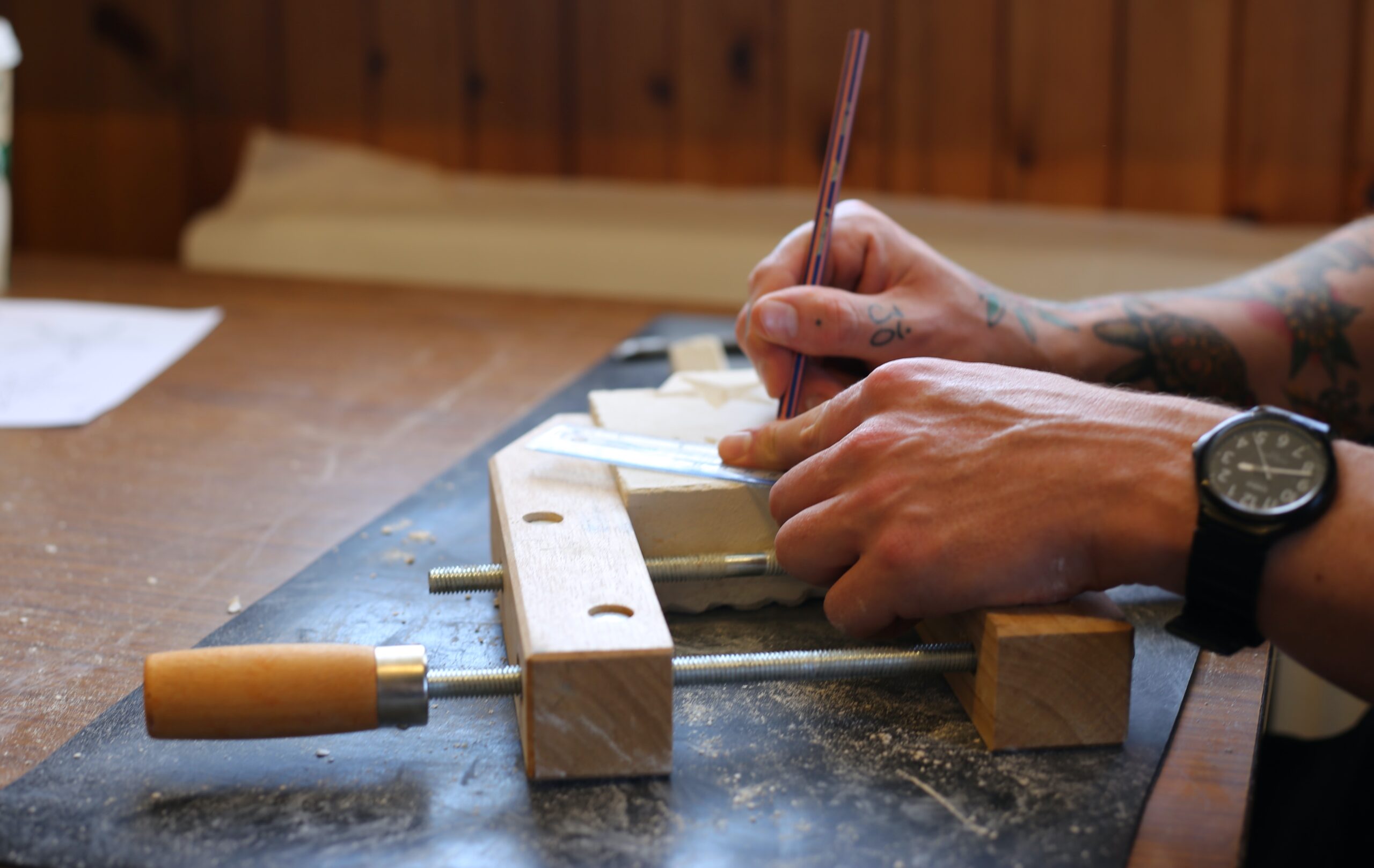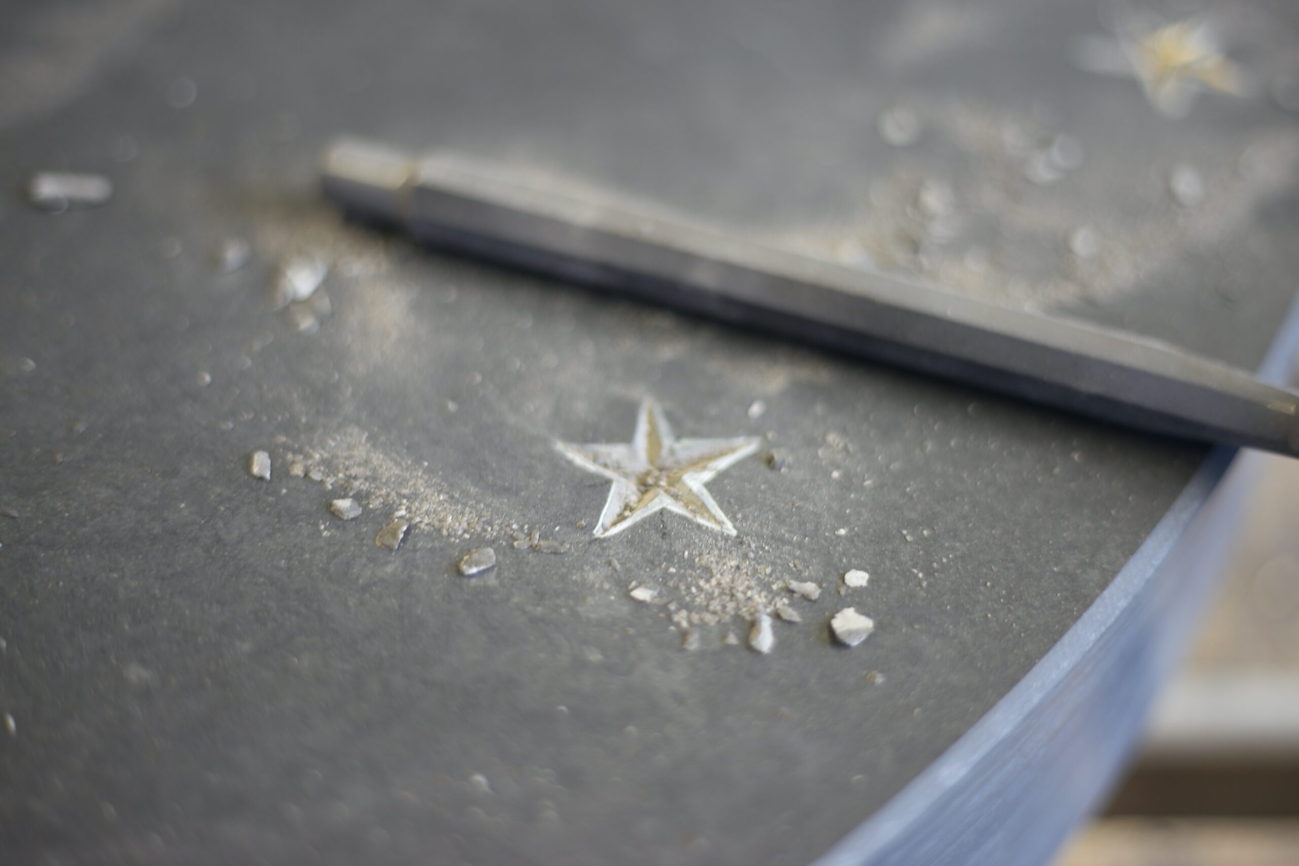 Caithness flag is made up of millions of years of mud, silt, dead fish and volcanic ash which were pressed together to form this fine-grained and extremely hard substance. After trying out the carving of stars on softer stone like limestone, attendants to the workshop began on the vast and beautiful counter tops. The flag seemed to have a will of its own, but responded to patience and persistence.