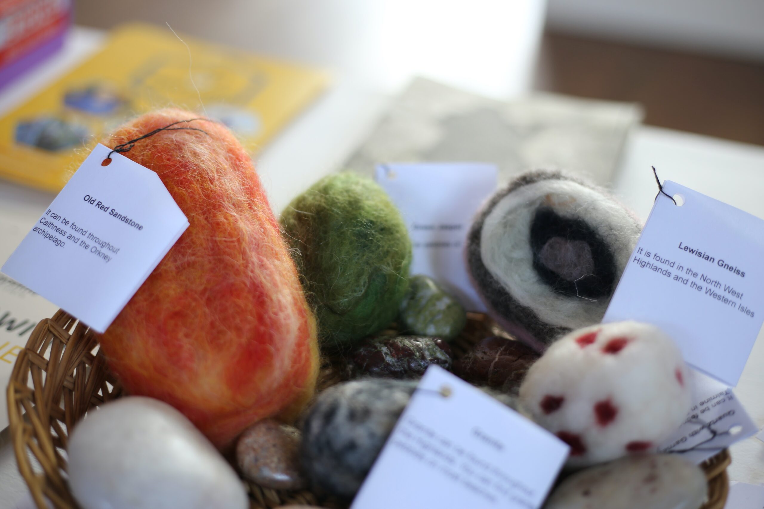 A final transformation came with Anne Grain’s merino wool pebbles. In exquisite detail she replicated old red sandstone, ammonite fossils, the Devonian fish, granite, jasper, quartz and chert. So realistic were these that after seeing the exhibition, visitors more than once assumed that the items would be heavy – it was with delight that they were found not only to be light, but soft!