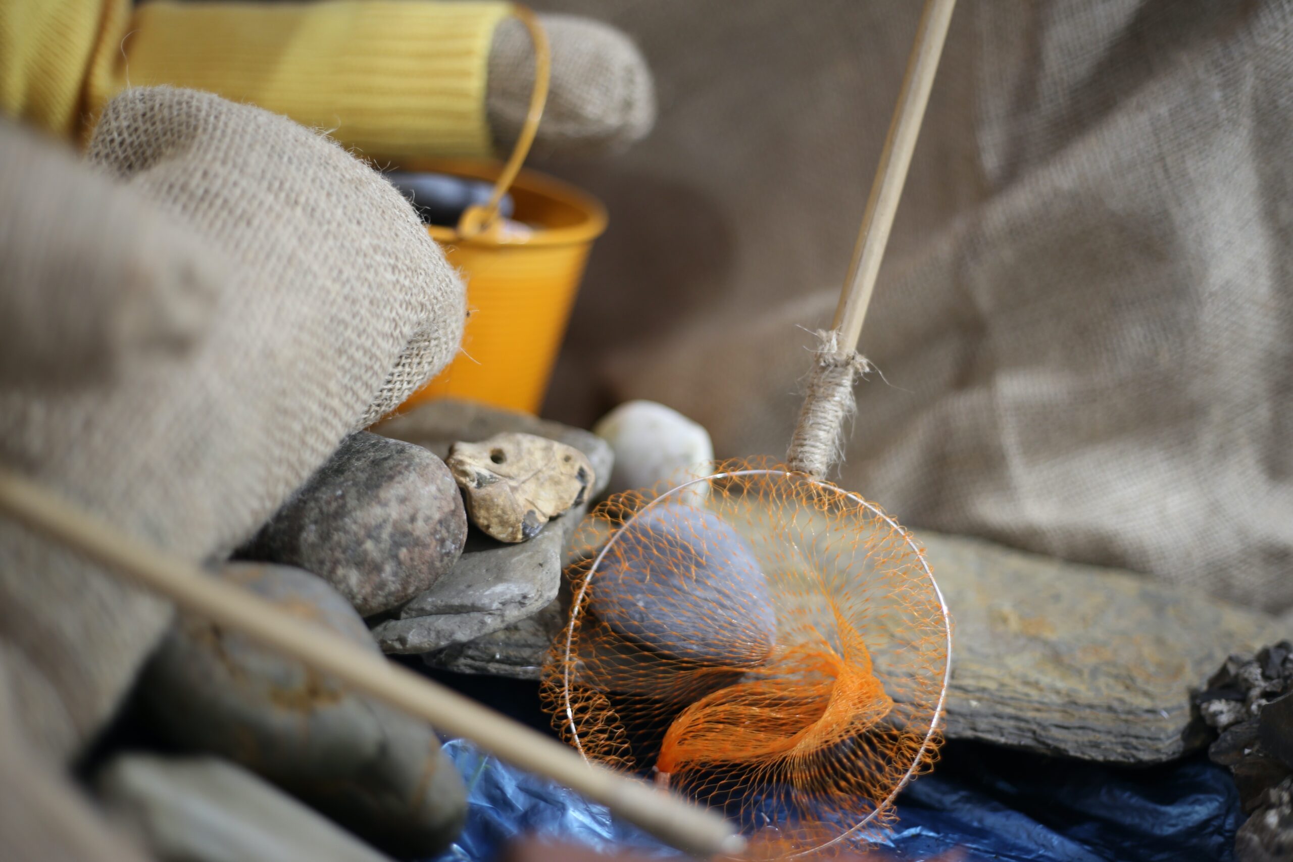 Around the seating area, where visitors could sit, chat and ponder the real serious questions in life (what is art? Is it just a pile of rocks rearranged into something else at a different time? Is that the beauty of it?) are fabric rocks made by lots of different people. Some are crocheted in bright colours, some knitted in grey. Some are little rocks in knitted coats, and some are raw wool felted into hard little nuggets. Anne’s felted pebbles are joyful, well-studied, and well-made. A conversation with her and her husband Mike at the 2024 exhibition were part of the inspiration for this Art and Stone Festival, as much as were the Caithness flag stone industry, painted pebbles, the Stone Age, Brochs, the Sutherland space port and the origins of the alter stone at Stonehenge.