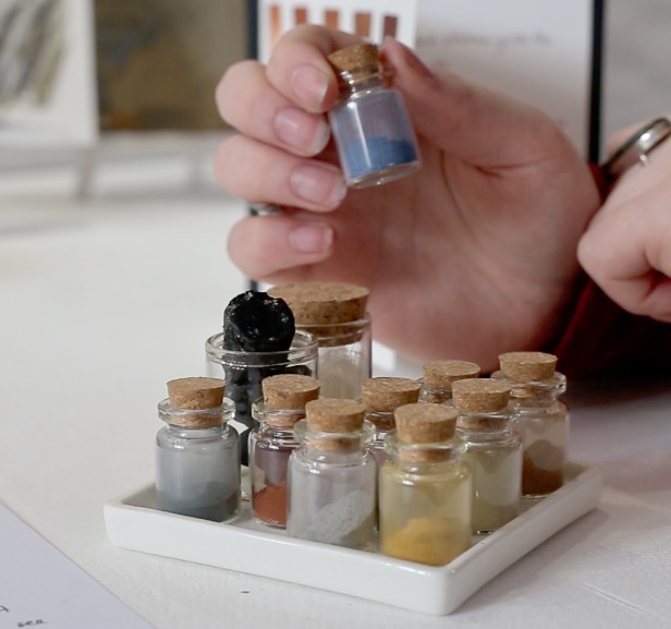 This and other sources of pigment have been collected by Justine from the landscape and ground down to extract a stunning array of colours. These are shown in tiny glass jars, with Dunnet forest charcoal. To bring these bottles of colour, Justine traipsed through the landscape on constant alert for rocks and pebbles of a specific type and hue. Instead of letting her mind wander and celebrating or condemning what weather there was, this artist took each step with the idea that it would bring her closer to the goal of creation.